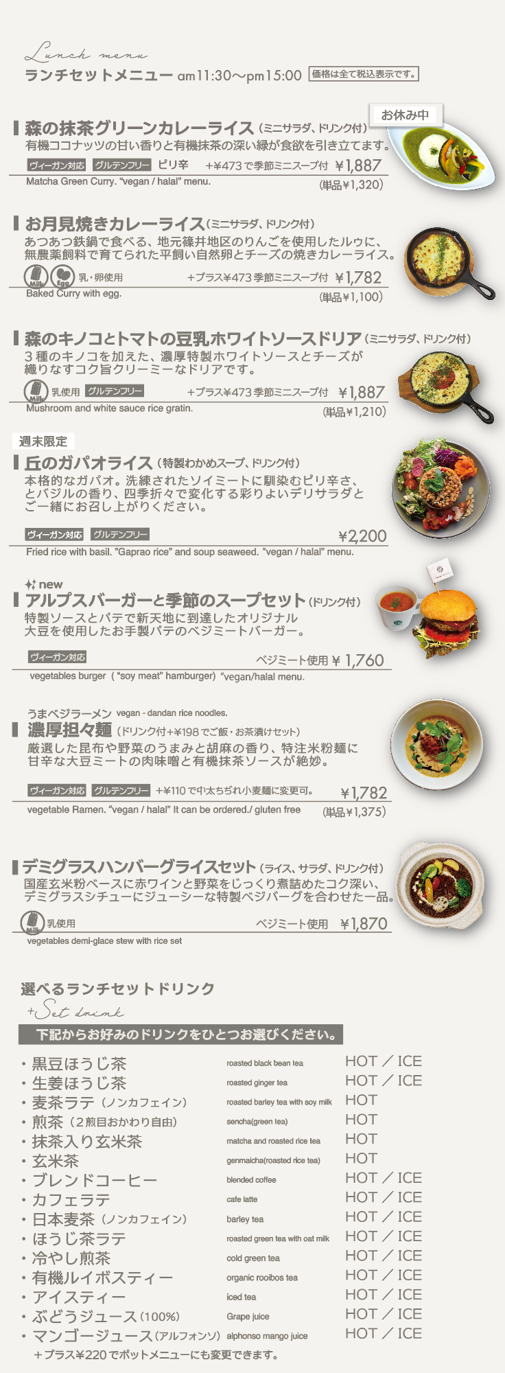 | ✛ Sweets スイーツ 🥮 ・抹茶クリーム京あんみつ ・濃抹茶ティラミス&小豆白玉の和パフェ ・ほうじ茶ガトーショコラ(ヴィーガン対応) ・抹茶のレアチーズケーキ ・濃抹茶の米粉ロールケーキ(グルテンフリー) ・白玉抹茶ぜんざい ・ソフトアイス宇治抹茶、牧場ミルク ┊期間限定スイーツ┊ ・季節のパウンドケーキ ・里山クランブルアップルパイ(ヴィーガン対応) ・杏仁バニラの濃厚抹茶アフォガード ・ほうじ茶のロールケーキ ・有機抹茶と黒豆のロールケーキ ・タンボヌカリッタ(抹茶生チョコタルト) ※他にもたくさんの日替わりデザート提供しております。 ┊人気おみやげお菓子┊ ・アルプスの森フィナンシェ ・お茶のポーションプリン EGCG |
